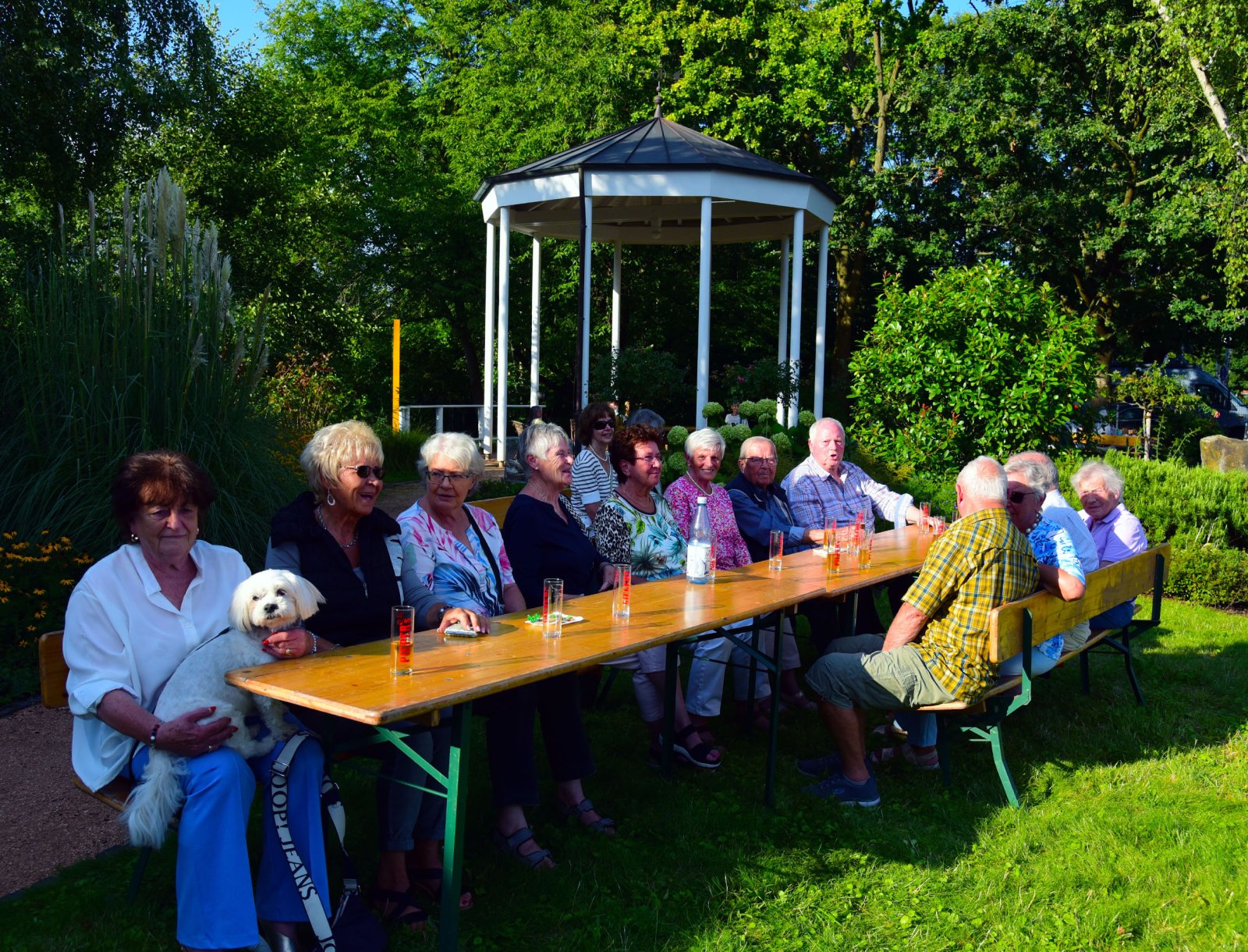 Mit zünftiger Blasmusik eröffneten die Roisdorfer Musikfreunde unter einem weiß-blauen Himmel das diesjährige Gewerbefest des Roisdorfer Gewerbevereins. Viele Roisdorfer und weitere Gäste zog es an diesem schönen Sonntagnachmittag in den Brunnenpark, um im Schatten der Bäume der Musik zu lauschen und es sich im Garten-Café Nelles bei einem frischen Kaffee und leckerem Kuchen gut gehen zu lassen. Hier konnten die Vorstandsmitglieder Harald Stadler, Bernhard Haberl und Astrid Anders, den Bäckermeister Herbert Nelles (3. v. l.) begrüßen, der 1984 als einer der Gründungsväter des Gewerbevereins extra zum 40ig-jährigen Geburtstagsfest der Roisdorfer Unternehmer gekommen war.