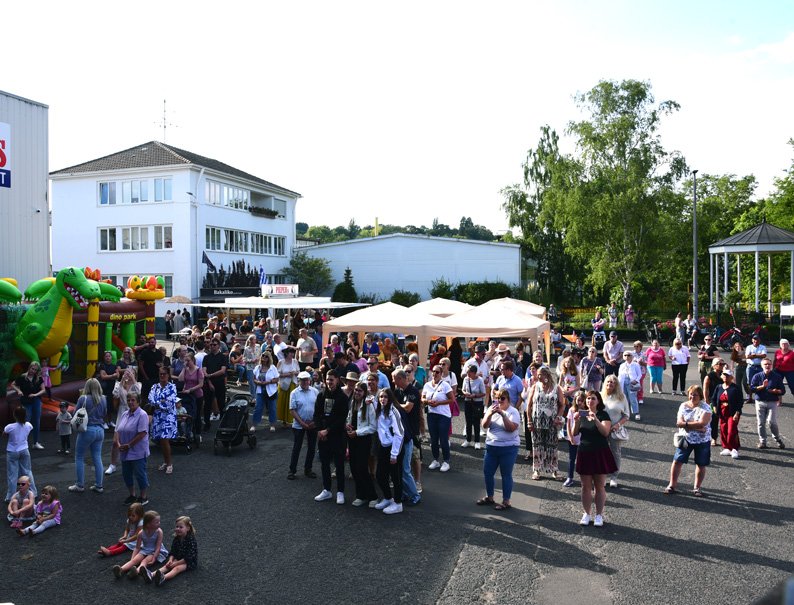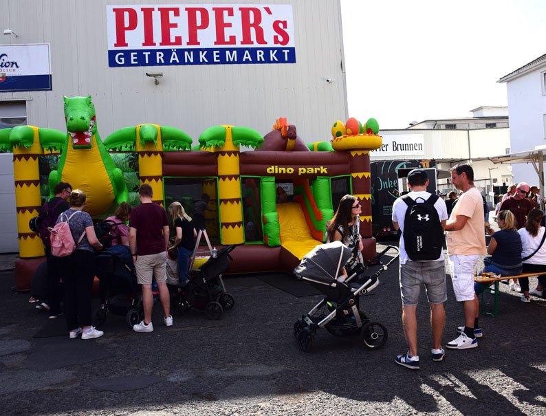 Alle Tischreihen waren besetzt und wer Lust hatte, konnte sich bei Juwelier Reiffert noch schnell über dessen erweiterte Angebotspallette vorabinformieren. In Kürze eröffnet die Firma Reiffert ihr neugestaltetes Uhrengeschäft an der Siegesstraße. Die Spedition Wirtz war mit ihrem Riesentruck und Oldtimern stark vertreten. Hier konnten sich Interessierte über das Arbeitsfeld eines Lkw-Berufsfahrer informieren. Die Kinder durften ins Lkw-Führerhaus klettern, staunten über die Größe der dortigen Schlafkabine und bewunderten die Fernsicht vom Fahrersitz aus. Eine Riesenhüpfburg mit Namen DINO lockte viele unserer jungen Gäste an, die ausgiebig dort nach Herzenslust toben konnten.