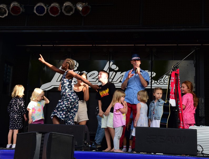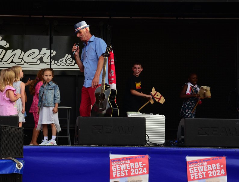 Die Bühne war inzwischen für den Ex-Roisdorfer Liedermacher und Sänger Willi Wilden frei gegeben worden, der aus seinen umfangreichen Repertoire an Liedern seine persönlichen Favoriten präsentierte. Die unmittelbare Beteiligung der Kinder war Willi Wilden ein besonders Anliegen und so rief er seine junge Fanschar auf die Bühne, um dort gemeinsam mit ihnen zu singen.