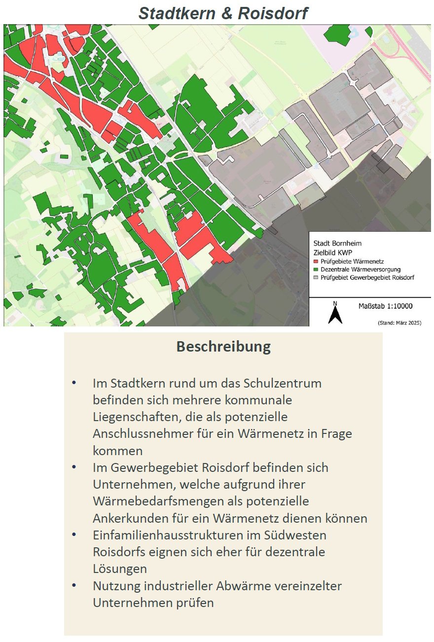 Außerdem ist es notwendig, die im Rahmen der Ersterstellung bereits begonnene, aktive Beteiligung von Gewerbetreibenden fortzusetzen. Deshalb ist geplant, über eine Kontaktaufnahme mit den interessierten Unternehmern ein Netzwerk aufzubauen, in dem mit Fachplanern und Energie-Experten gemeinsam eine mittelfristige Strategie zur Dekarbonisierung der Wärmeversorgung im Gewerbegebiet Bornheim-Süd erarbeitet wird. Einbezogen in diese Planung werden auch Großverbraucher im Bereich des Roisdorfer Zentralbezirks: Rings um das SUTI-Center, vom Rathaus entlang der Königstraße bis zum Hallenfreizeitbad einschließlich der Gesamtschule (rote Markierung im Bild 1) und zusätzlich entlang der Roisdorfer Brunnenallee/Brunnenstraße, zuzüglich der drei Roisdorfer Seniorenheimen. Dies wären weitere Bereiche in Bornheim/Roisdorf, die als mögliche zukünftige Wärmenetzgebiete in der vom Stadtrat beschlossenen Wärmeplanung als Optionen für eine zentrale Wärmeversorgung vorgeschlagen werden.