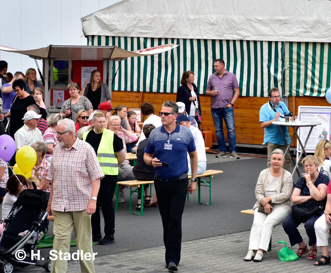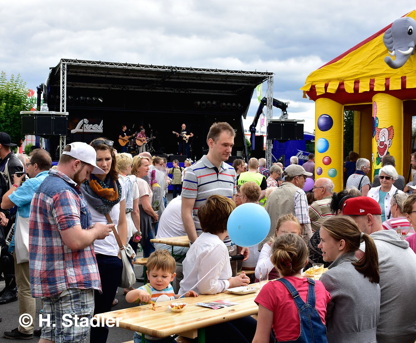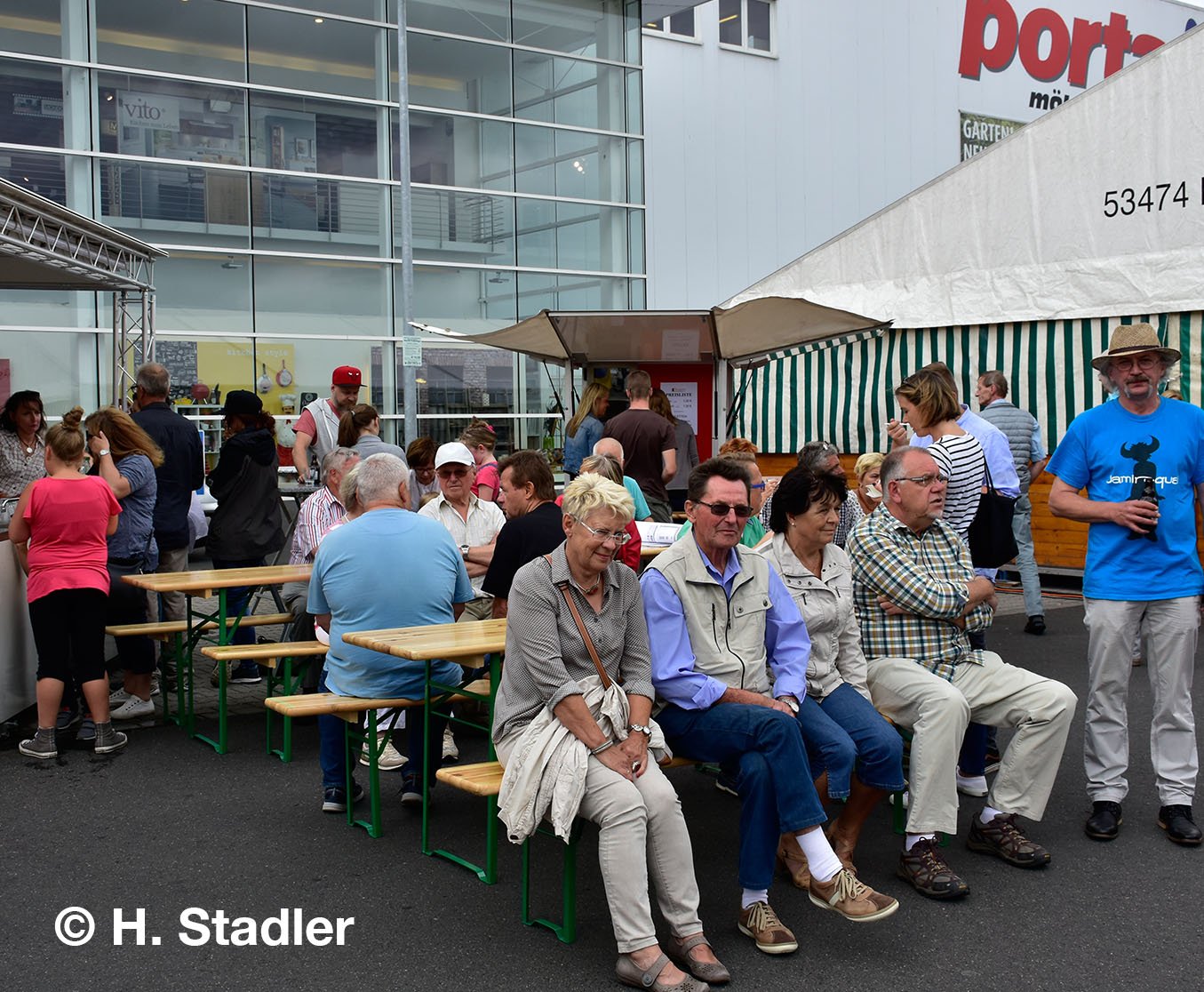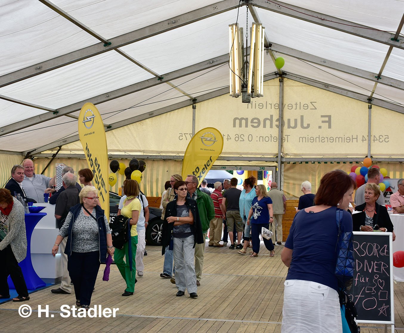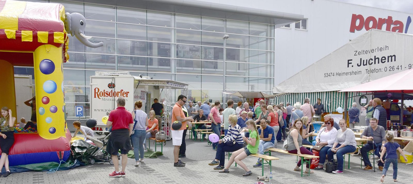 Vor dem PORTA-Möbelhaus hatten wir neben unserem Messezelt diesmal einen geräumigen Festplatz für die großen und kleinen Gäste unseres Familienfestes eingerichtet. Eine große Showbühne und gleich drei Attraktionen für unsere „Pänz“, verbunden mit Getränke- und Imbissständen rundeten das Bild eines in sich geschlossenen Gewerbemarktes ab.