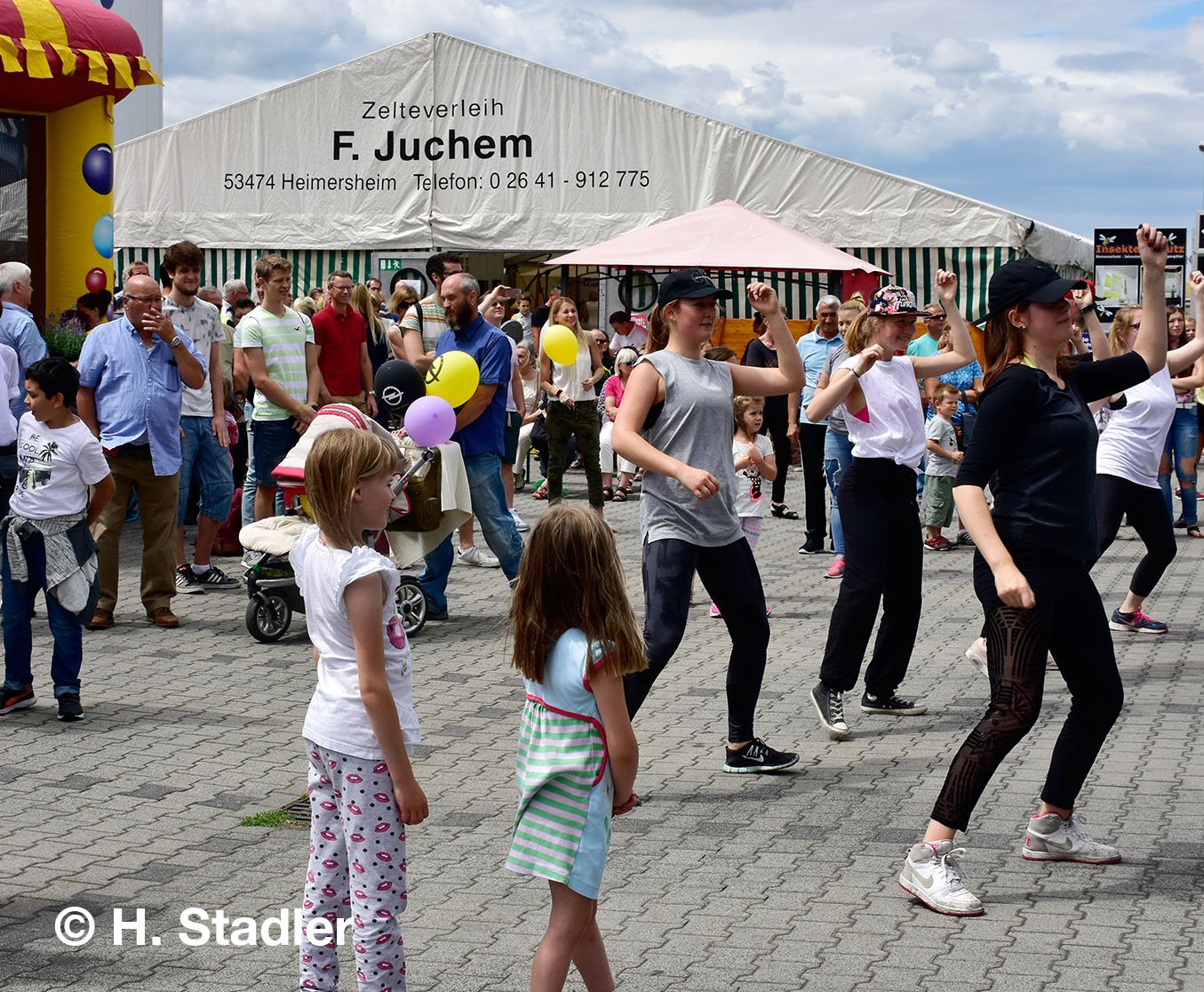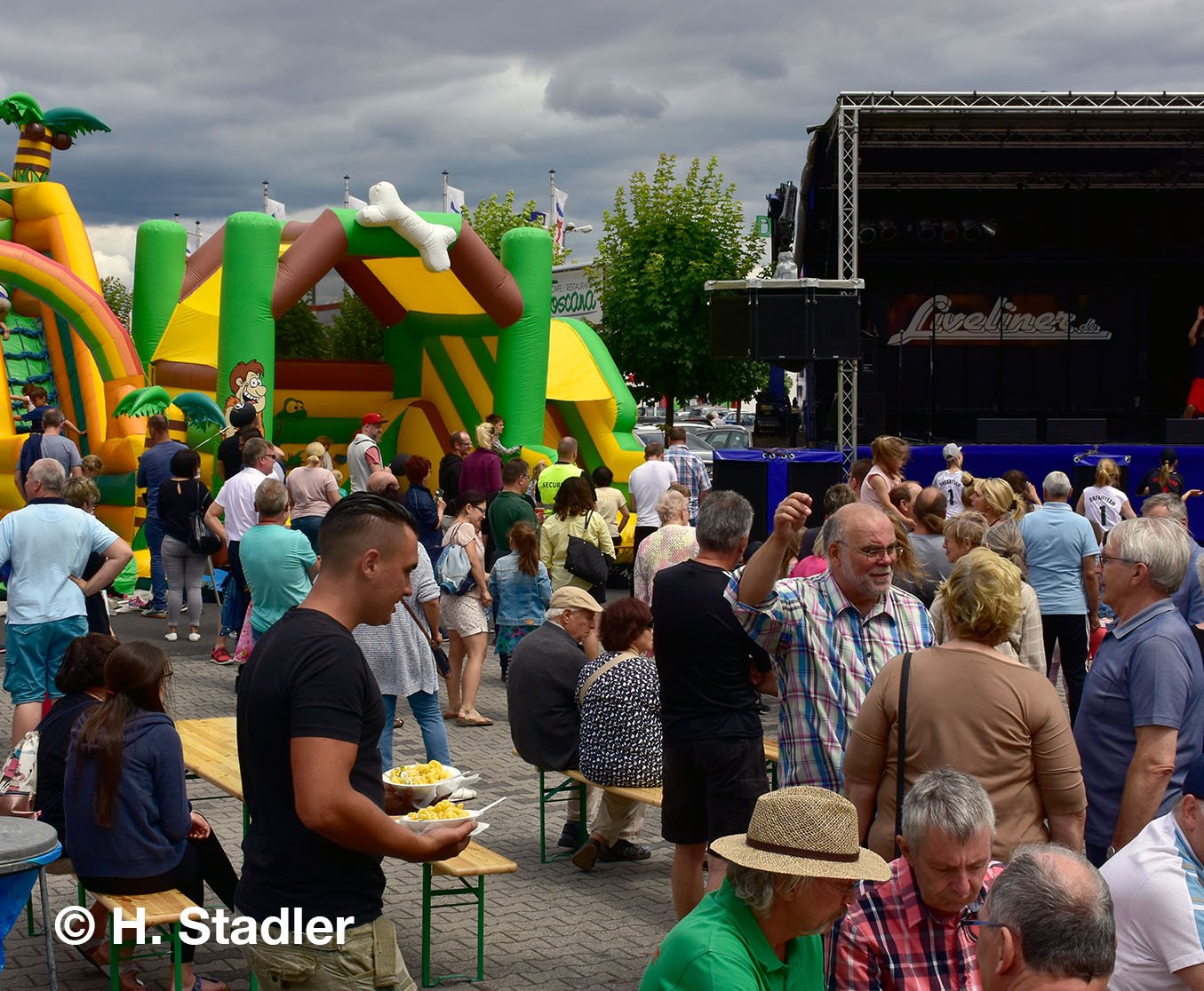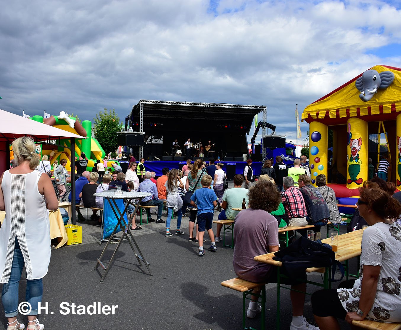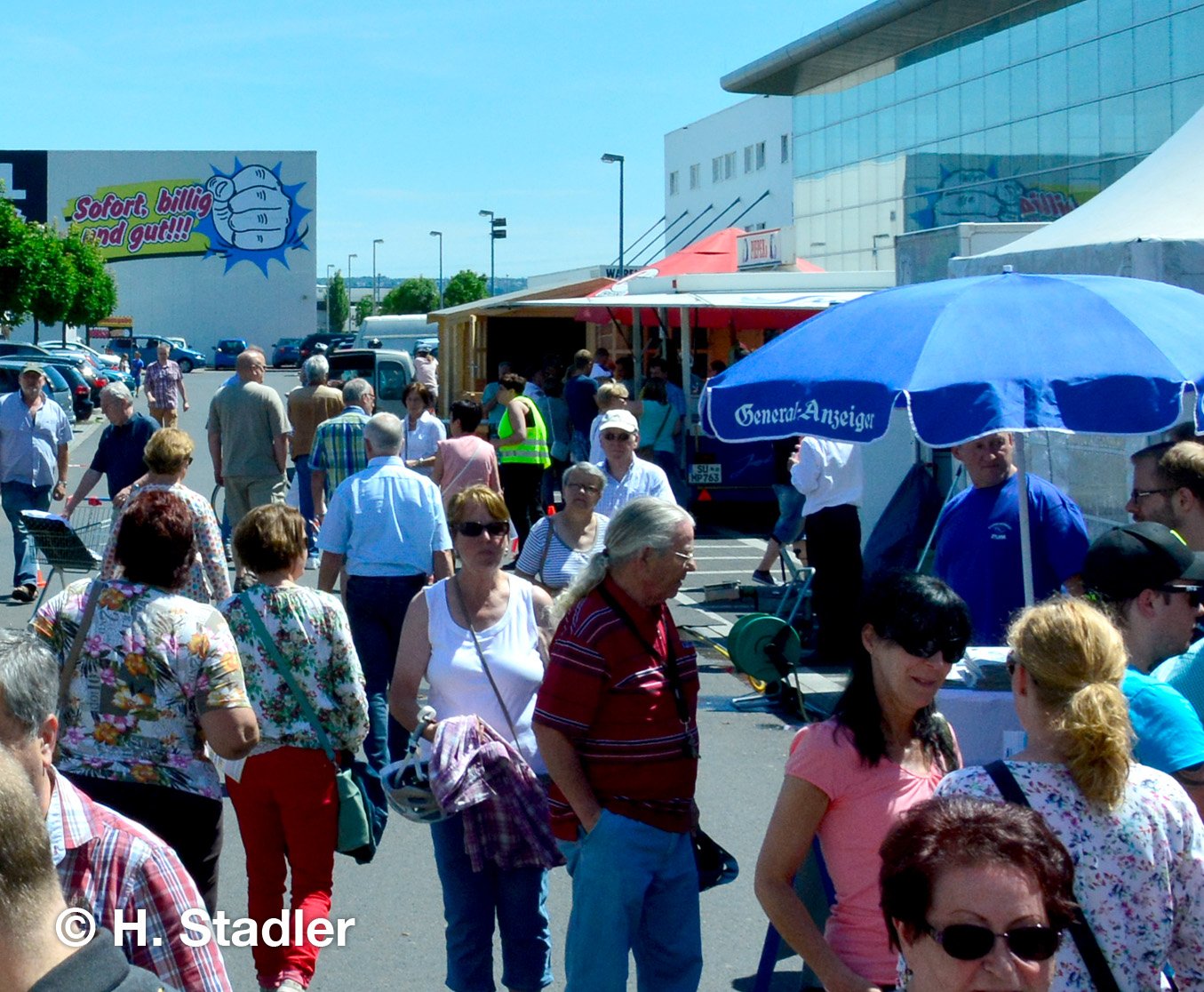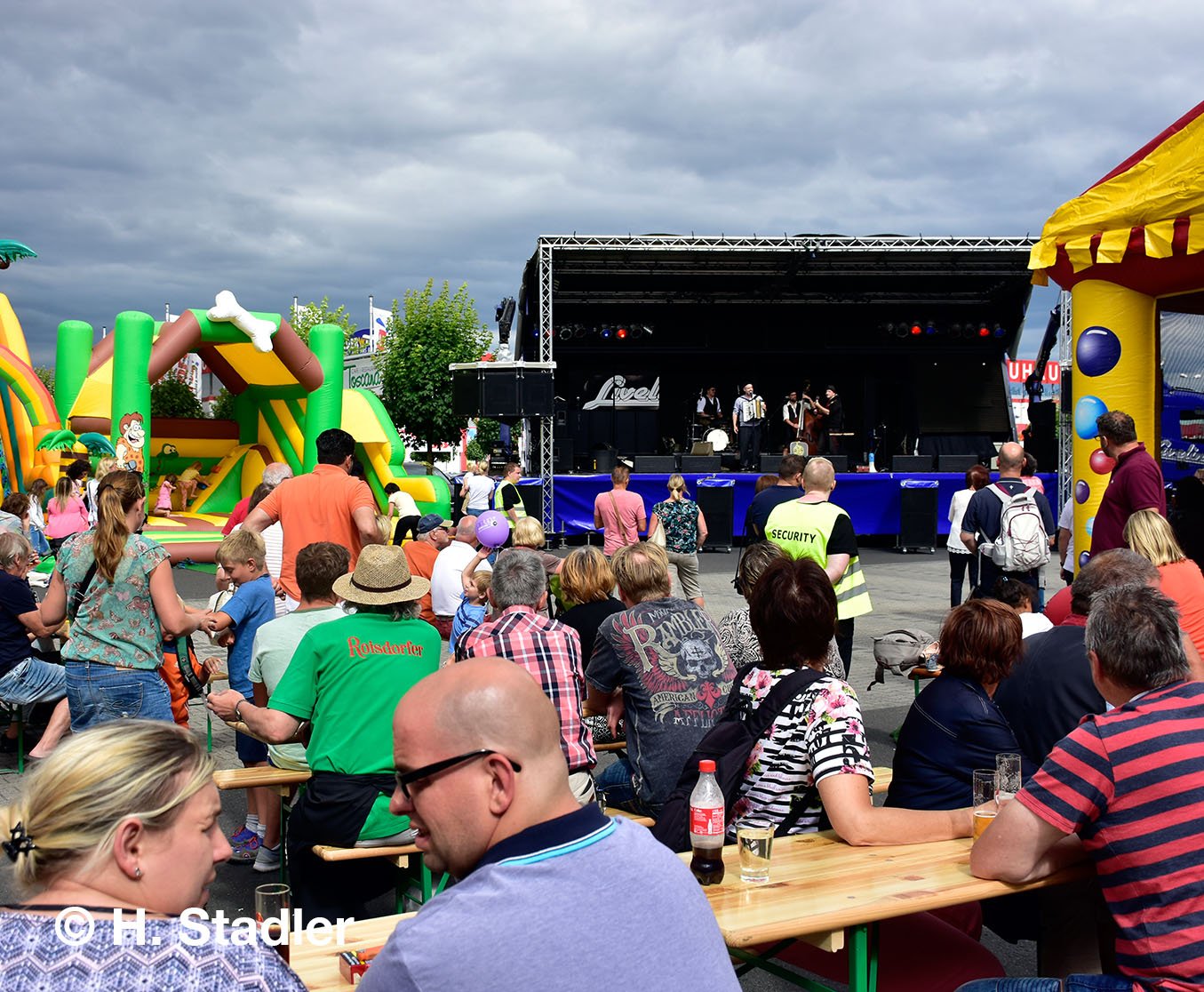 Vor dem PORTA-Möbelhaus hatten wir neben unserem Messezelt diesmal einen geräumigen Festplatz für die großen und kleinen Gäste unseres Familienfestes eingerichtet. Eine große Showbühne und gleich drei Attraktionen für unsere „Pänz“, verbunden mit Getränke- und Imbissständen rundeten das Bild eines in sich geschlossenen Gewerbemarktes ab.